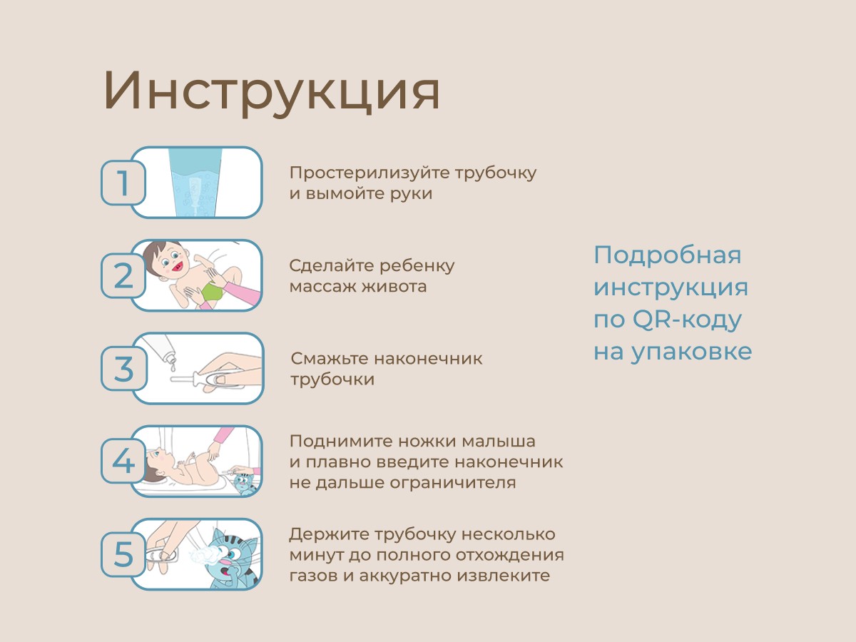 Газоотводная трубка для новорожденных от ROXY-KIDS является многоразовой и позволяет быстро и эффективно облегчить отхождение газов и уменьшить боль от коликов в животике. Уникальность данного изделия состоит в возможности его многоразового применения, а также в атравматичном наконечнике, что позволяет безболезненно и комфортно вводить трубочку. Трубка может использоваться в больницах или в домашних условиях. При использовании трубочки исключена возможность травмирования, потому что в конструкции предусмотрен ограничитель для безболезненного и безопасного проведения процедуры. Сделана из гипоаллергенного современного полимера ТЭП, безопасного для здоровья малыша. Трубочка имеет единую конструкцию без раздельных частей. Допустима стерилизация кипячением. В ассортименте ROXY-KIDS представлены 2 вида дизайна газоотводных трубочек. Медицинское изделие имеет регистрационное удостоверение.