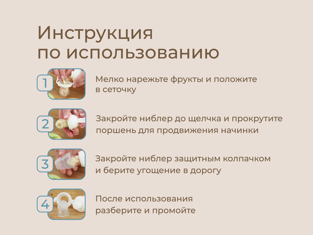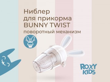 Ниблер для ввода первого прикорма BUNNY TWIST от ROXY-KIDS безопасен и удобен в использовании. С его помощью можно начать вводить в рацион питания малыша овощи, фрукты и печенье. Малыш сможет кушать самостоятельно без риска подавиться. Сначала нужно поместить в ниблер кусочки определенной еды, а затем закрепить контейнер на ручке до щелчка. После этого малыш сможет всасывать содержимое по аналогии с пустышкой, привыкая к вкусу повседневной взрослой еды. В ниблере предусмотрен поршень, которым можно протолкнуть еду внутри сеточки при вращении ушек ниблера. В комплект входит прочная силиконовая сеточка, которая не боится первых зубок малыша. Она безопасна для детского здоровья, ее очень легко мыть, а также можно докупить отдельно в случае износа. У ниблера есть колпачок, который позволит взять ниблер с собой на прогулку или в поездку. Ниблер поможет уменьшить боль от прорезывания зубов с использованием охлажденных фруктов или овощей при прикорме.