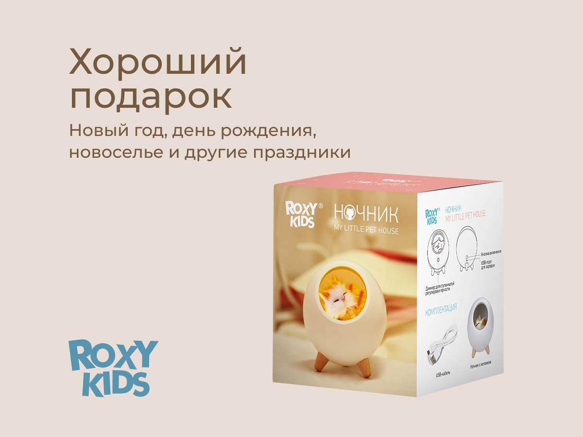 Детский ночник с мягким рассеянным светом и простым минималистичным дизайном в виде домика для котенка украсит спальню ребенка и сделает любой интерьер уютнее. Фигурка котика внутри ночника сделана вручную. Котенок крепится на магнит и легко вынимается для игр. 10 LED-лампочек обеспечивают равномерное свечение. Ночник снащен диммером для плавной ступенчатой регулировки яркости. Встроенный 1200 мАч литий-ионный аккумулятор обеспечивает возможность работы без подзарядки около 20 часов. Ночник заряжается при помощи комплектного кабеля микро-USB от сети или компьютера. Световой индикатор позволяет определить, когда ночник полностью заряжен. Управление осуществляется одной кнопкой в задней части корпуса.