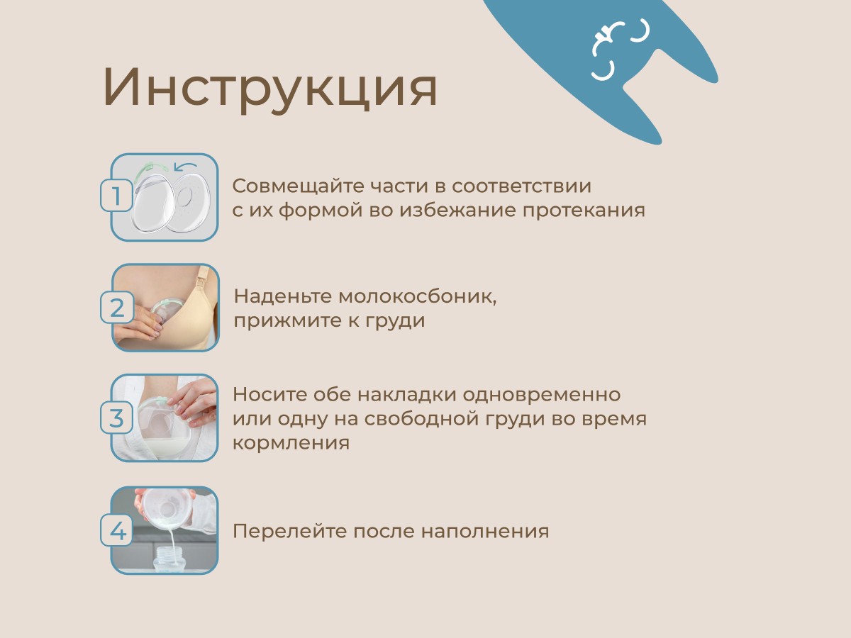 Молокосборник – это незаменимый аксессуар для кормящих мам, который предназначен для сбора грудного молока на протяжении всего периода лактации. Молокосборники позволяют избежать протекания грудного молока на одежду, сохраняют материнское молоко и способствуют заживлению поврежденных сосков. Они изготовлены из гипоаллергенного материала, не содержат вредных веществ и абсолютно безопасны для здоровья мамы и малыша. Силиконовая заглушка надежно закрывает отверстие для переливания молока во время использования молокосборников и исключает протекание. Молокосборники надежно прилегают и незаметны под одеждой, благодаря мягкой силиконовой части они не вызывают дискомфорта и подходят для ежедневного использования. В комплект входит 2 накладки по 40 мл и пластиковый футляр для гигиеничного хранения, который удобно брать с собой в дорогу. Молокосборник прост в использовании: поместите молокосборник под нижнее белье или спортивный топ и прижмите к груди. После заполнения перелейте молоко в подходящий сосуд через отверстие сверху и используйте повторно при необходимости. Носите обе накладки в промежутках между кормлением грудью. Используйте одну накладку на свободной груди для сохранения молока во время кормления. Перед применением стерилизуйте молокосборник с помощью стерилизатора, СВЧ или кипячения. Совмещайте пластиковую и силиконовые части в соответствии с их формой во избежание протекания.