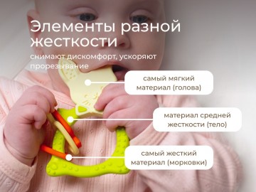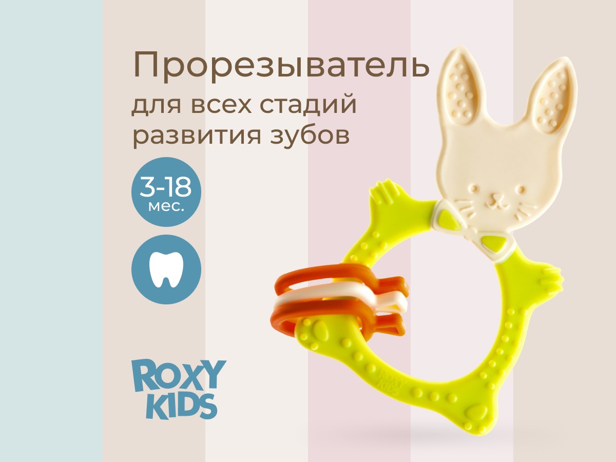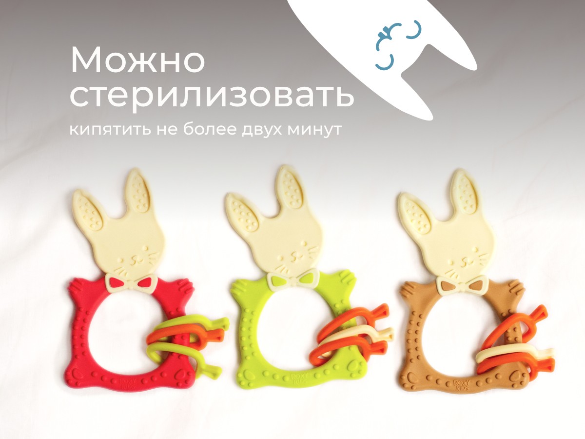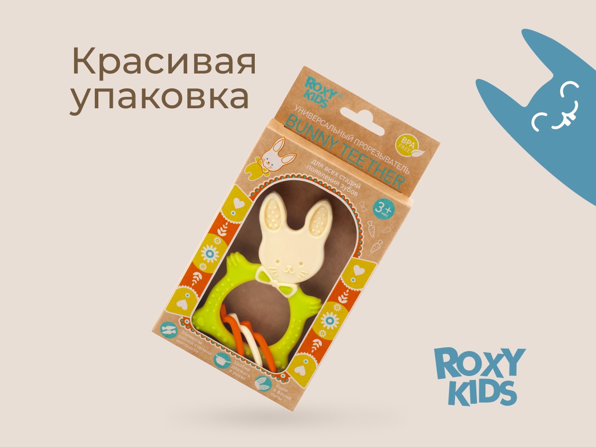 Прорезыватель для зубов BUNNY TEETHER от ROXY-KIDS подходит для всех стадий прорезывания зубов у малышей. Он состоит из элементов различной степени жесткости, что позволяет малышу использовать на протяжении всего времени прорезывания. На начальном этапе, когда у малыша раздражены десны, он может чесать их о мягкую рельефную голову зайчика. На завершающем этапе малыш сможет грызть более твердое тело и твердые морковки для лучшего эффекта. BUNNY TEETHER пригодится даже при прорезывания жевательных зубов, потому что ушки зайца по форме похожи на капу, что позволит малышу снять зуд с самых дальних десен. Прорезыватель сделан из безопасных гипоаллергенных материалов (термоэластопласта и полипропилена), так что ребенок может грызть его целыми днями. Еще одна отличительная особенность BUNNY TEETHER это тело, сделанное в форме кольца, которое малыш сможет удобно держать. В ассортименте ROXY-KIDS прорезыватели BUNNY TEETHER представлены в нескольких цветах. Соответствует стандартам безопасности товаров для детей.