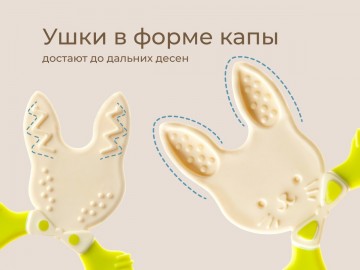 Благодаря ушам выполненным в форме капы, BUNNY подойдет даже при прорезывании жевательных зубов. Малышу будет удобно кусать его так, чтобы снять зуд с самых дальних десен.