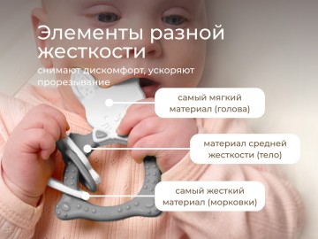 Прорезыватель для зубов BUNNY TEETHER от ROXY-KIDS подходит для всех стадий прорезывания зубов у малышей. Он состоит из элементов различной степени жесткости, что позволяет малышу использовать на протяжении всего времени прорезывания. На начальном этапе, когда у малыша раздражены десны, он может чесать их о мягкую рельефную голову зайчика. На завершающем этапе малыш сможет грызть более твердое тело и твердые морковки для лучшего эффекта. BUNNY TEETHER пригодится даже при прорезывания жевательных зубов, потому что ушки зайца по форме похожи на капу, что позволит малышу снять зуд с самых дальних десен. Прорезыватель сделан из безопасных гипоаллергенных материалов (термоэластопласта и полипропилена), так что ребенок может грызть его целыми днями. Еще одна отличительная особенность BUNNY TEETHER это тело, сделанное в форме кольца, которое малыш сможет удобно держать. В ассортименте ROXY-KIDS прорезыватели BUNNY TEETHER представлены в нескольких цветах. Соответствует стандартам безопасности товаров для детей.