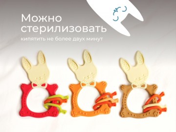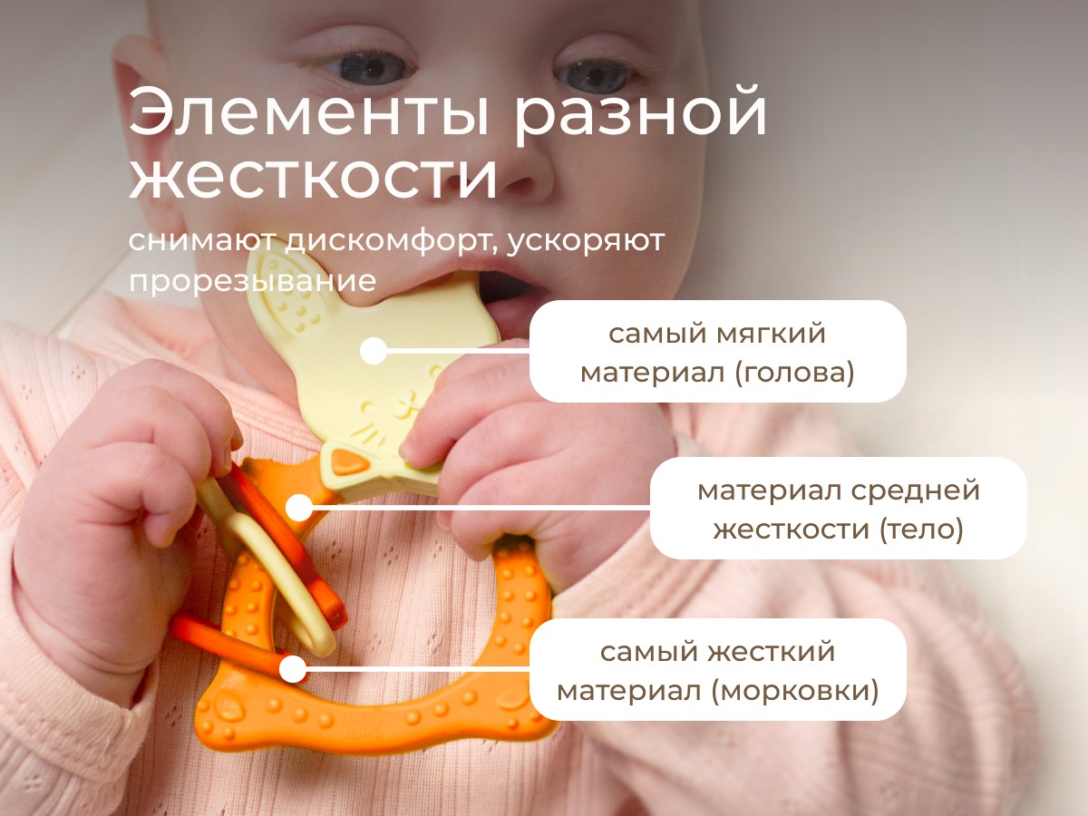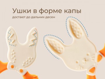 Благодаря ушам выполненным в форме капы, BUNNY подойдет даже при прорезывании жевательных зубов. Малышу будет удобно кусать его так, чтобы снять зуд с самых дальних десен.
