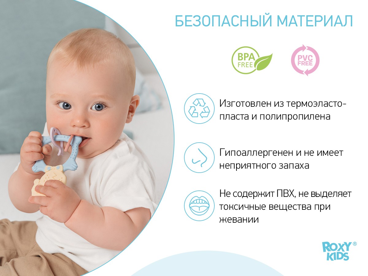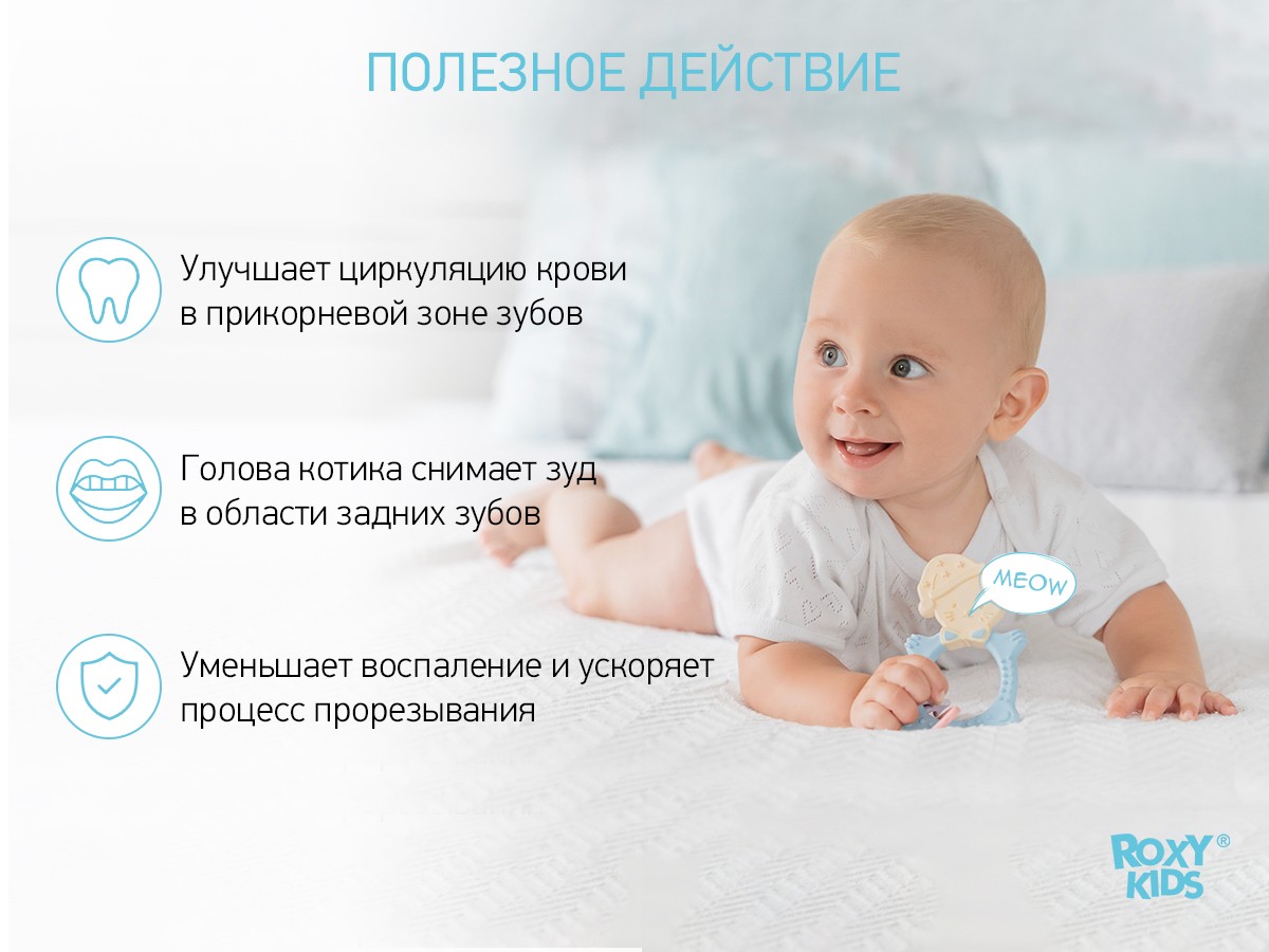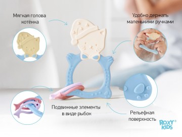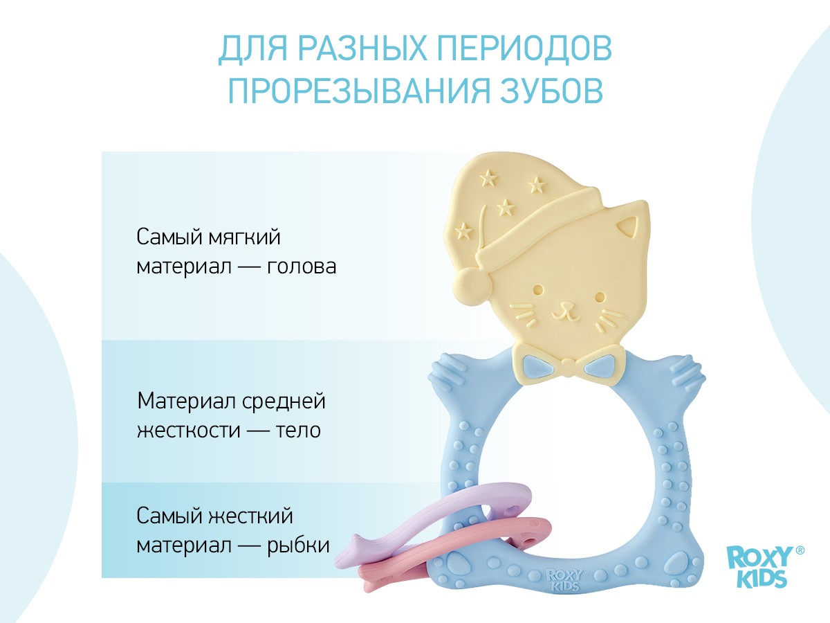 Прорезыватель для зубов MEOW TEETHER от ROXY-KIDS подходит для всех стадий прорезывания зубов у малышей. Он состоит из элементов различной степени жесткости, что позволяет его использовать на протяжении всего времени прорезывания. На начальном этапе, когда у малыша раздражены десны, он может чесать их о мягкую рельефную голову котенка. На завершающем этапе малыш сможет грызть более твердое тело и жесткие элементы в виде рыбок для лучшего эффекта. Прорезыватель сделан из безопасных гипоаллергенных материалов (термоэластопласта и полипропилена), так что ребенок может грызть его целыми днями. Еще одна отличительная особенность MEOW TEETHER – это тело, сделанное в форме кольца, которое малыш сможет удобно держать. В ассортименте ROXY-KIDS прорезыватели MEOW TEETHER представлены в нескольких цветах. Соответствует стандартам безопасности товаров для детей.