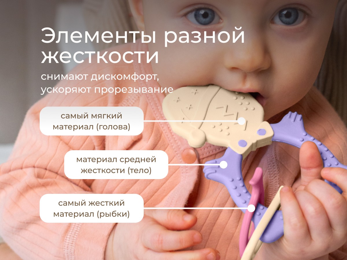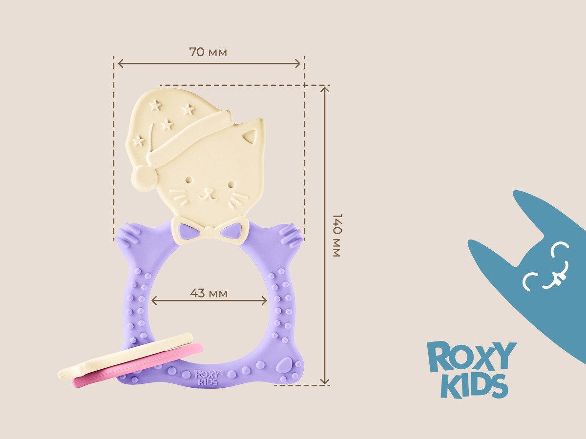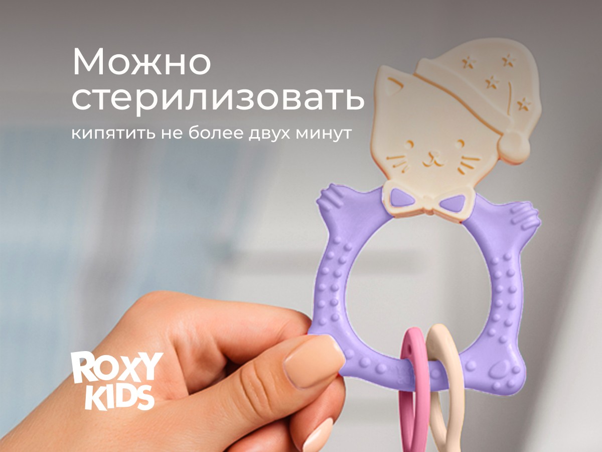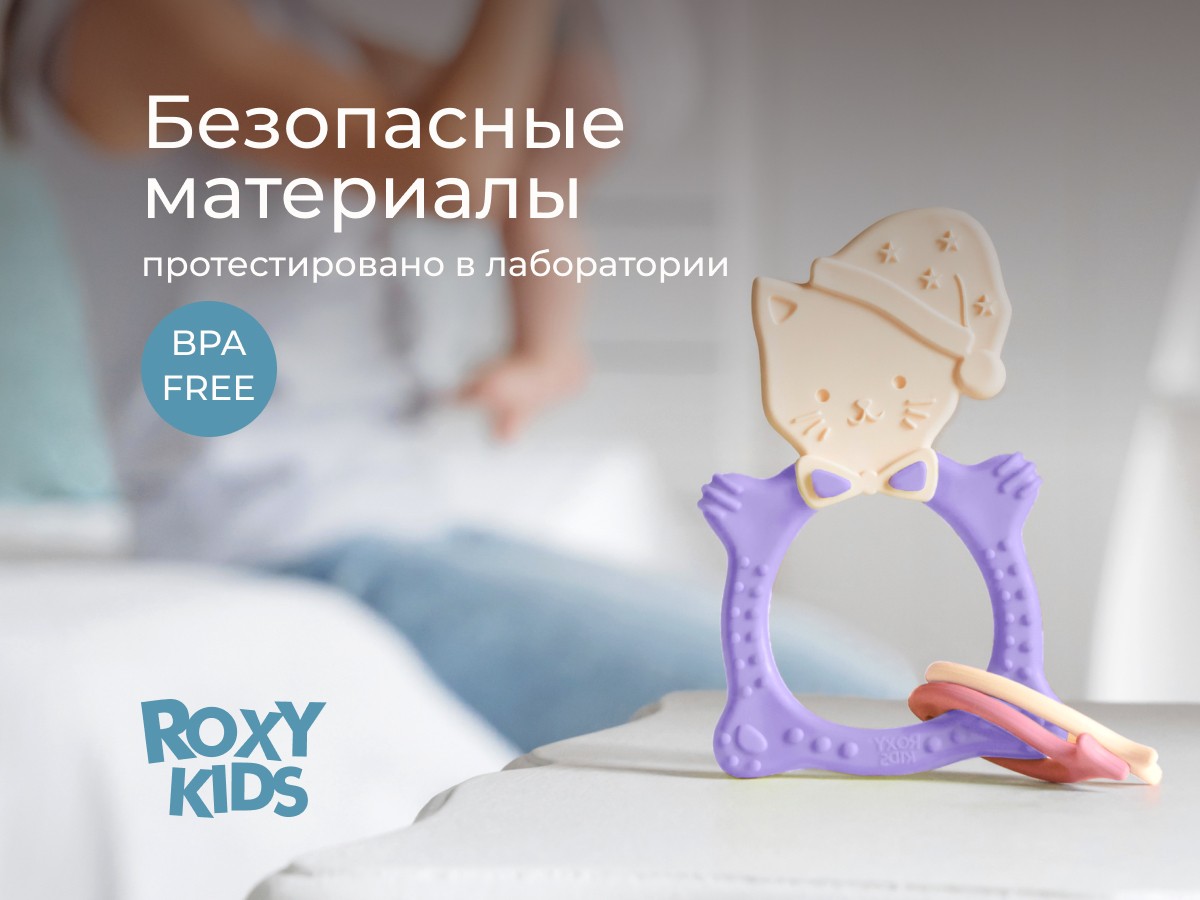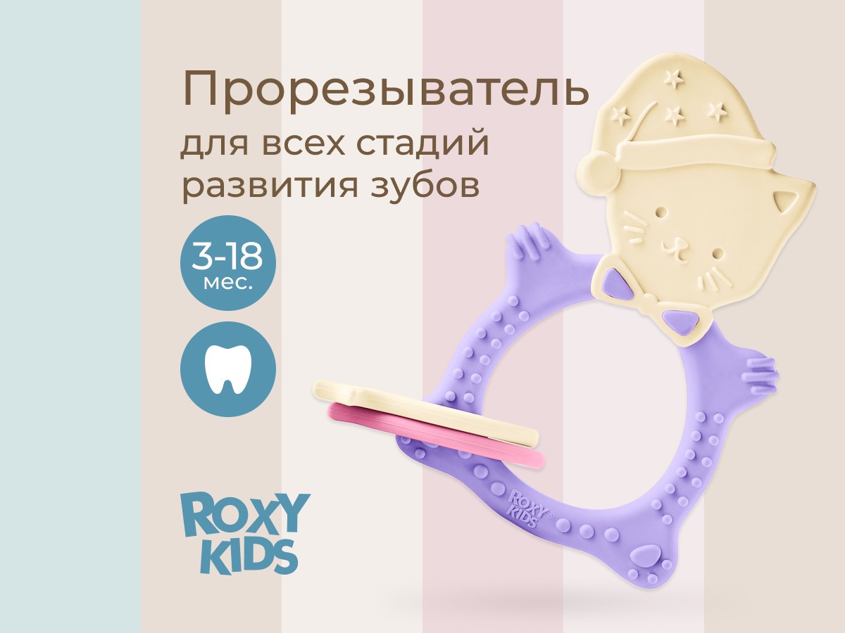 Прорезыватель для зубов MEOW TEETHER от ROXY-KIDS подходит для всех стадий прорезывания зубов у малышей. Он состоит из элементов различной степени жесткости, что позволяет его использовать на протяжении всего времени прорезывания. На начальном этапе, когда у малыша раздражены десны, он может чесать их о мягкую рельефную голову котенка. На завершающем этапе малыш сможет грызть более твердое тело и жесткие элементы в виде рыбок для лучшего эффекта. Прорезыватель сделан из безопасных гипоаллергенных материалов (термоэластопласта и полипропилена), так что ребенок может грызть его целыми днями. Еще одна отличительная особенность MEOW TEETHER – это тело, сделанное в форме кольца, которое малыш сможет удобно держать. В ассортименте ROXY-KIDS прорезыватели MEOW TEETHER представлены в нескольких цветах. Соответствует стандартам безопасности товаров для детей.