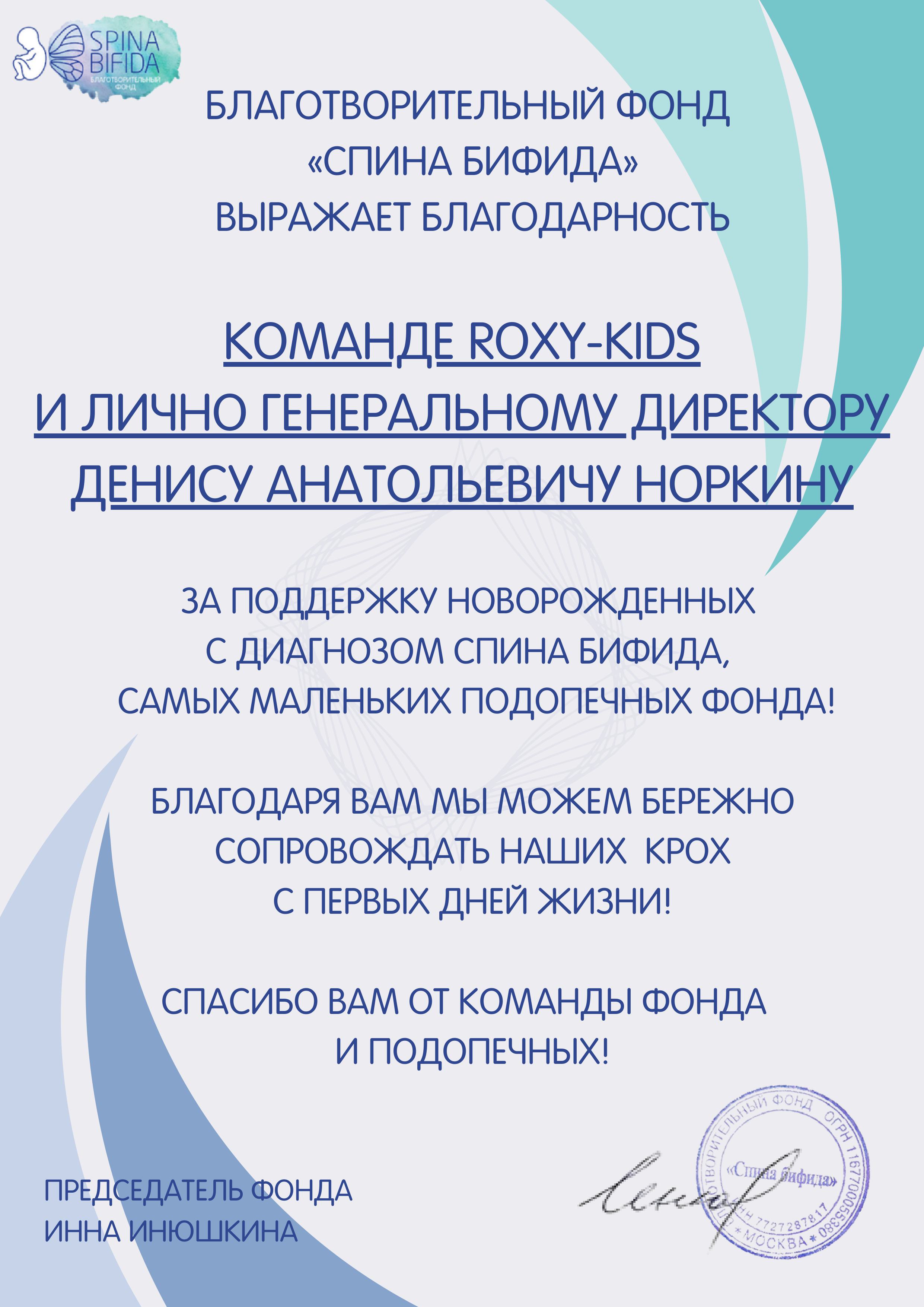 Команда ROXY-KIDS искренне рада возможности поддержать деятельность фонда. Мы верим, что подобное участие позволяет семьям почувствовать внимание, опору и человеческое тепло, которые так необходимы в непростые моменты. Для нас это не просто благотворительность, а способ выразить искреннюю сопричастность и заботу о тех, кто особенно в этом нуждается.